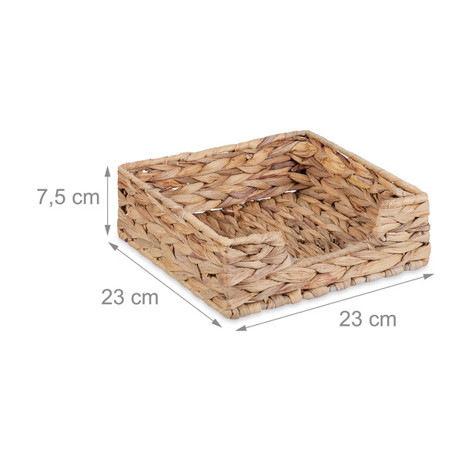 Dieser stilvolle Serviettenhalter aus natürlicher Wasserhyazinthe sorgt für eine organisierte Tischdekoration in Küche, Wohnzimmer, auf dem Balkon oder der Terrasse. Durch die robuste Bauweise mit Metallrahmen ist er besonders stabil und langlebig.