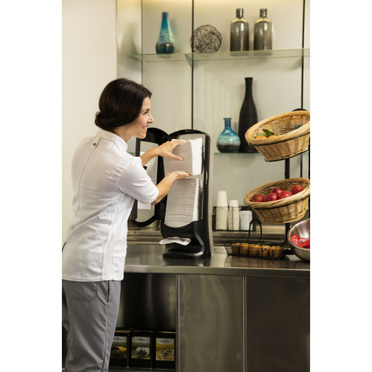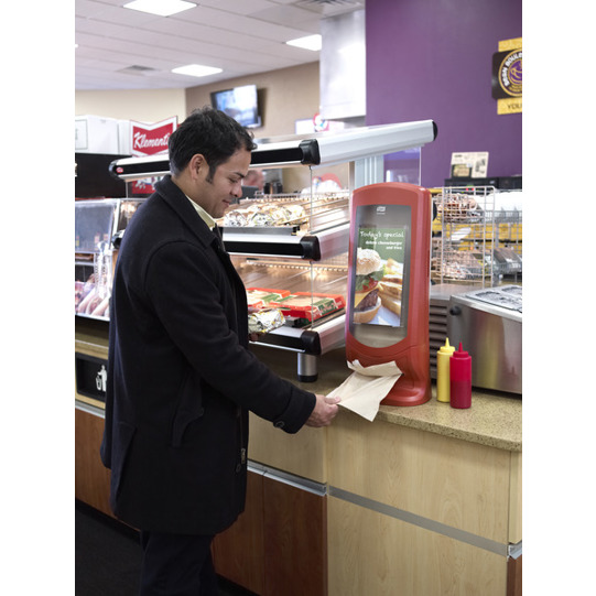 Der Tork Xpressnap® Steh- und Wandspender für Servietten ist optimal für Schnellrestaurants mit hoher Besucherfrequenz und hinterlässt bei den Gästen einen guten Eindruck. Dank des aufrecht stehenden Designs und der Wandhalterung ist der Serviettenspender flexibel einsetzbar, entweder auf der Theke oder an der Wand befestigt.